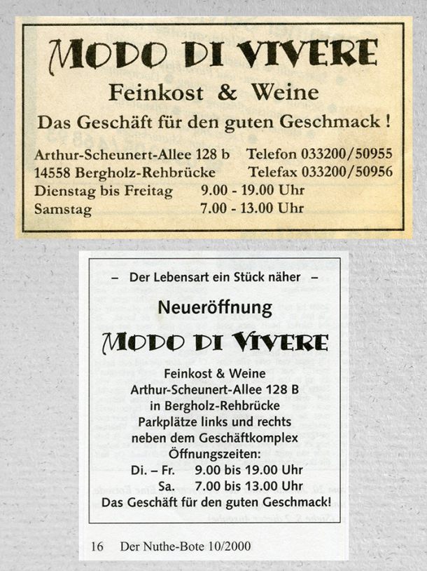 Ich setzte alles auf eine Karte. Am 15. September 2000, einem Freitag, eröffnete ich den Feinkostladen "MODO DI VIVERE" in Bergolz-Rehbrücke.